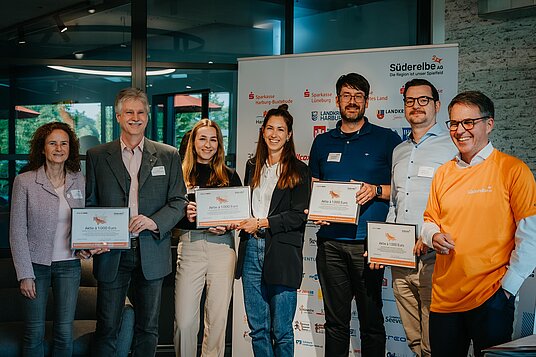 © Gina Kühn - Vertelln Gruppenbild Neuaktionärev.l.n.r.:v.l.n.r.: Anke Stenzel-Dose & Detlev Dose (Seevetaler Warenhotel GmbH & Co. KG) Michelle Kosian & Nina Eigenfeld (mina marketing eGbR), Stefan Dendorfer (Linsenspektrum), Nicolas Schrader (Iken Design GmbH), Dr. Olaf Krüger (Süderelbe AG)