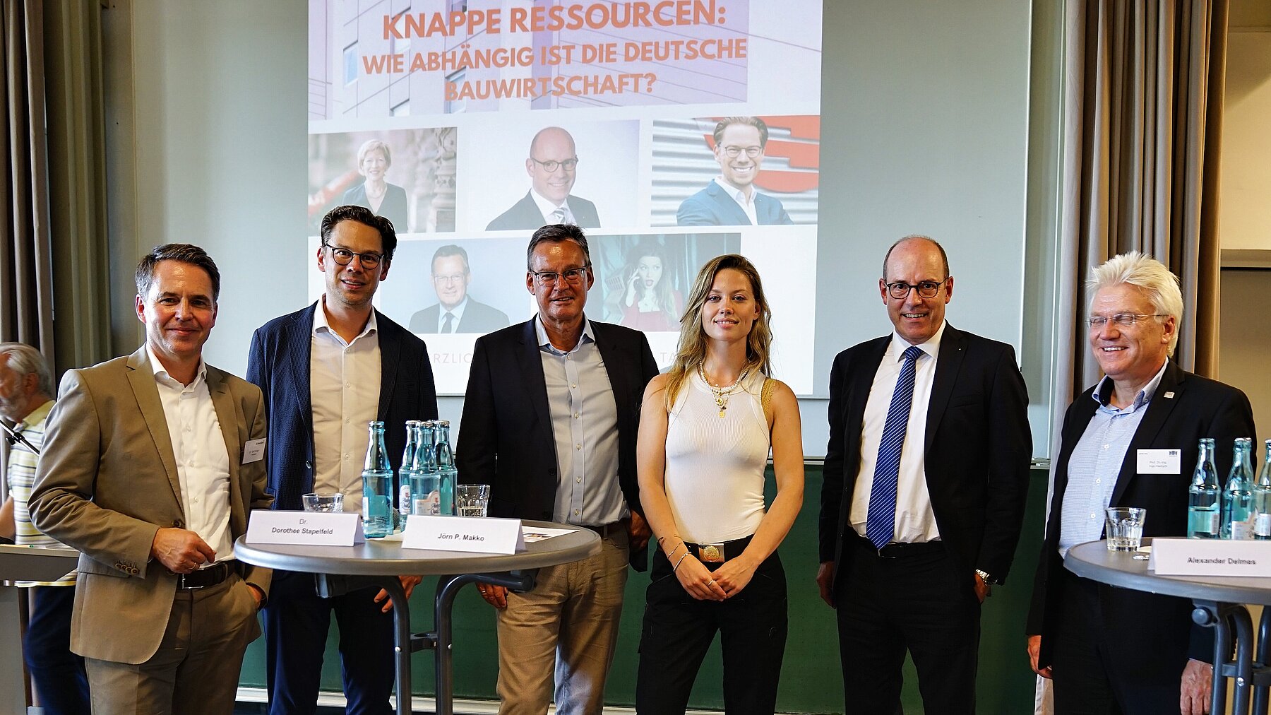 © Süderelbe AG (v.l.n.r.): Gruppenfoto mit einem Teil der Referenten: Dr. Olaf Krüger; Vorstand Süderelbe AG, Alexander Delmes; Geschäftsführer bauwelt Delmes Heitmann & Co KG., Axel Gedaschko; Präsident Bundesverband deutscher Wohnungs- und Immobilienunterneh-men e.V., Isabelle Vivianne; die.Tischlerin, Baufluencerin, , Jörn P. Makko; Hauptgeschäftsführer des Bauindustriebverbands Nie-dersachsen-Bremen e.V., Prof. Dr. Ingo Hadrych; Präsident hochschule 21